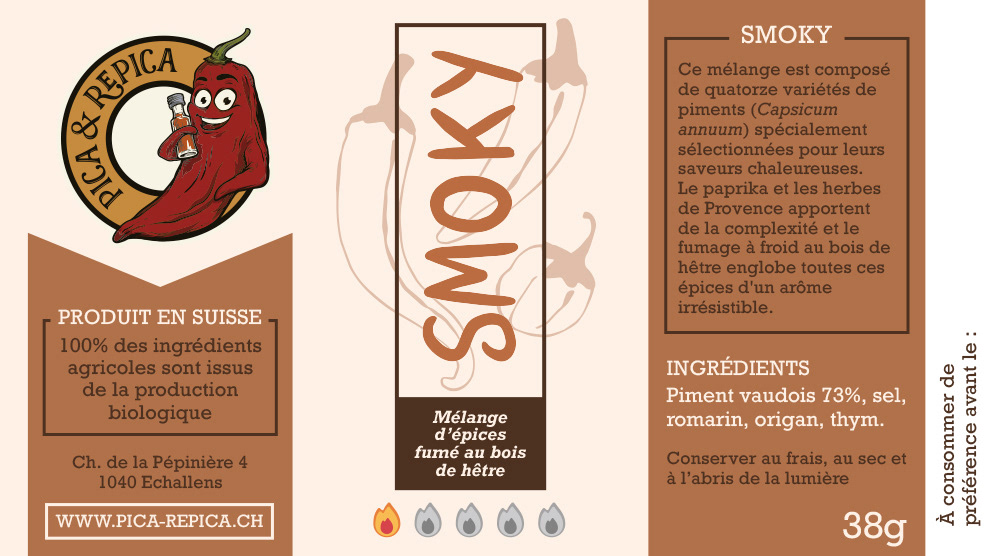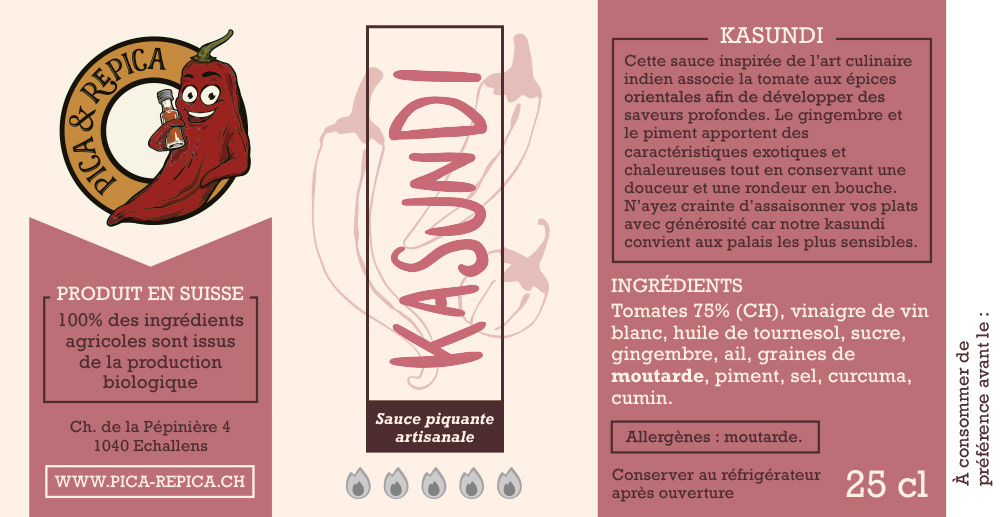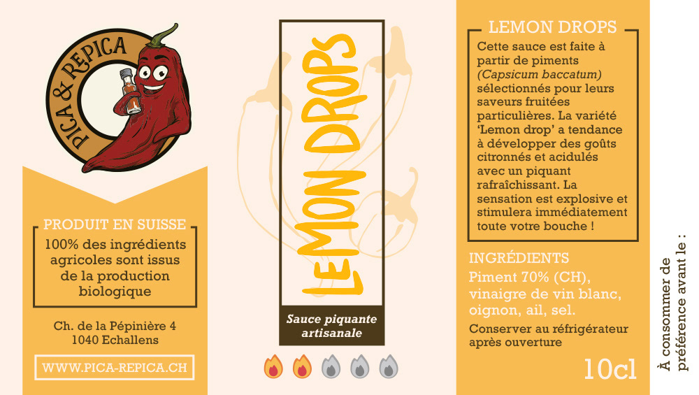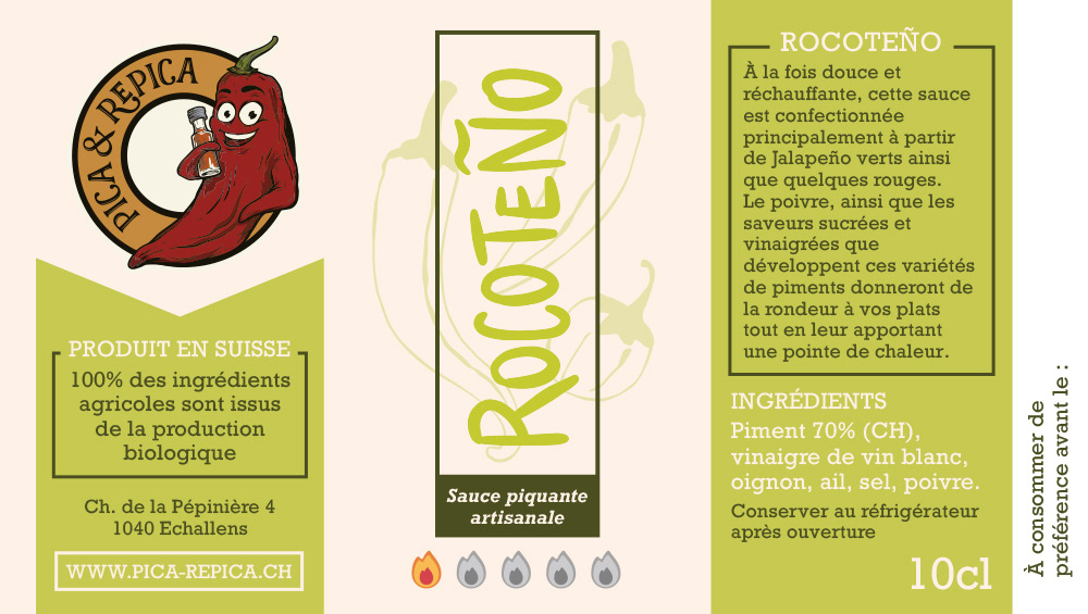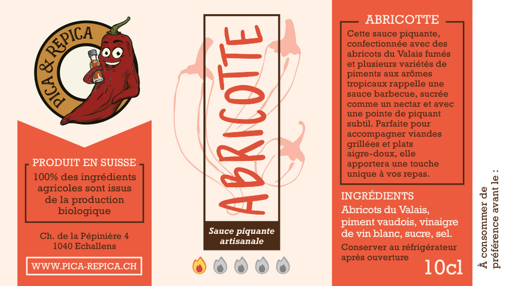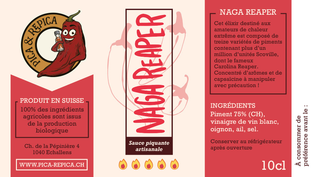 Conception d'étiquettes pour des sauces piquantes artisanales fabriquées en Suisse, à partir de piments cultivés biologiquement sur place.